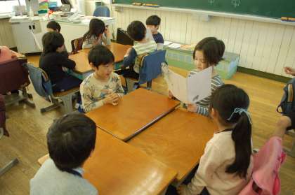 本日のランランタイム(朝の学習の時間)で、2年生が1年生に教材のお気に入りの場面の読み聞かせをしました。読んでいるのは「なりきり会話」という学習活動で作成した、それぞれの子どもが授業で作成したオリジナルの本です。