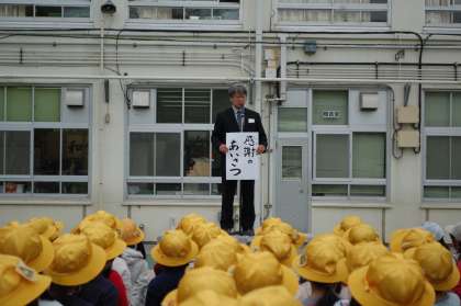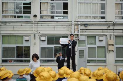校長先生から、登下校時に児童の安全を守るために道に立ってくださっている方々に、感謝のきもちを込めてきちんとあいさつをしましょう、とお話がありました。