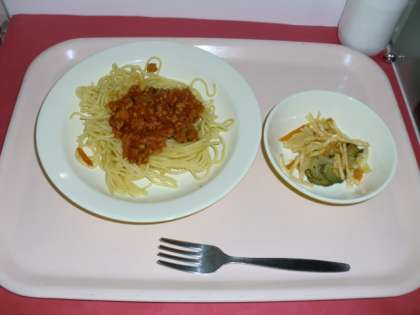今日は、人気メニューのスパゲッティミートソースです。