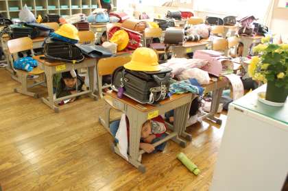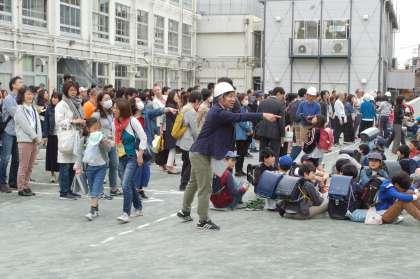 大地震等が起こった場合、原則児童は学校で保護者引き取りの上、下校となります。その訓練が行われました。1年生は学校での避難訓練は初めてでした。地震の際、身を守る方法を訓練できました。