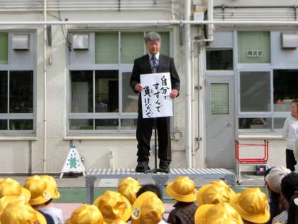 あいさつ運動の活動は、児童が進んで行っている、ということを紹介され、自分から進んで様々なことに取り組んでみましょう、とお話されました。