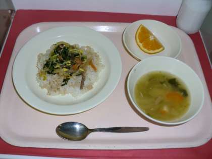 ビビンバ 牛乳 豆腐と野菜のスープ くだもの