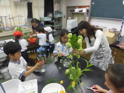 本日の「花を生ける日」の活動の様子です。今日は生けた花の管理の仕方も指導していただきました。こまめな水替えと、枯れてしまったらきちんとお礼を言ってから、小さく切って捨てることを指導していただきました。