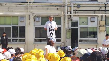 今朝の校長先生のお話は、「協力」。協力には、力が4つも集まっていること、今、六年生が組体操の練習で力を合わせて頑張っていること、今週末の運動会に向けみんなさで協力して取り組んでほしいことをお話しされました。