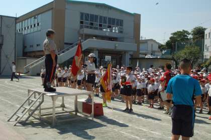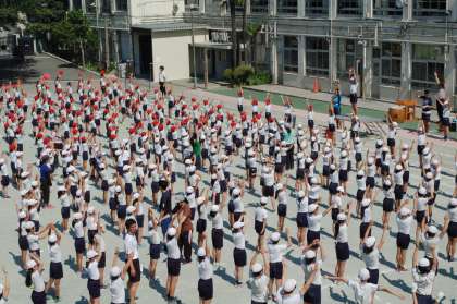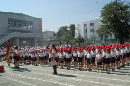 1時間目は運動会全校練習。内容は、開会式や準備運動、応援の練習です。1つ1つ確認しながら進めています。