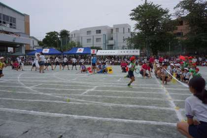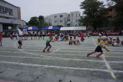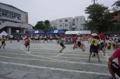 午前最後の種目は、1〜3年の代表児童によるリレーです。各学級から選ばれた選手の力強い走りは、見ごたえがありました。この勝負は、緑チームの優勝で幕を閉じました。