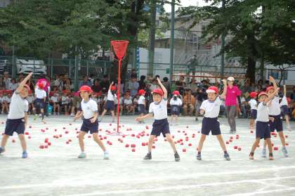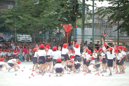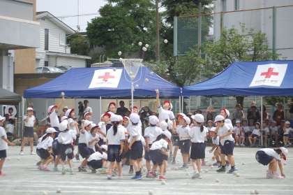 1年生の団体競技は、玉入れです。合間合間のダンスも見どころでした。エビカニクスの曲に合わせて踊り、合図で精一杯かごに向かって玉を投げました。互いに頑張った1年生、勝負は引き分けでした。