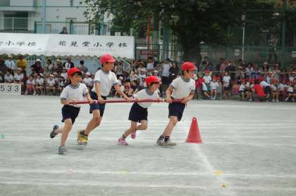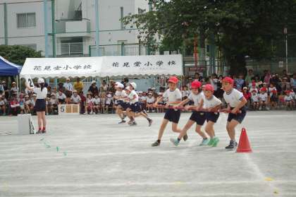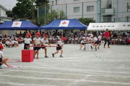 3年生の団体競技は、「台風の目」。でも、今年は例年とはちょっと違います。スタート後、ルーレットを引くと、コーンを回る回数が決まるのです。1ならラッキー!、3だと目が回る!? この勝負は、紅組の2連勝で終わりました。