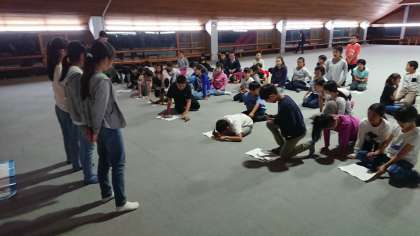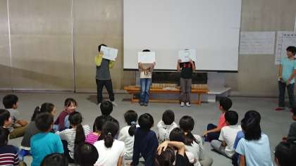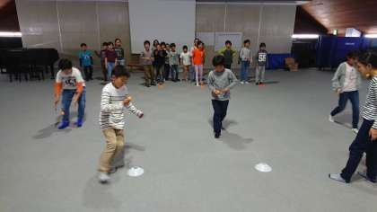 キャンプファイアは明日に延期して、今日は室内レクです。レク係ががんばりました。