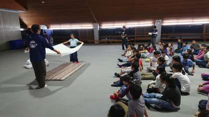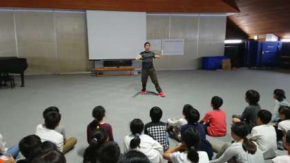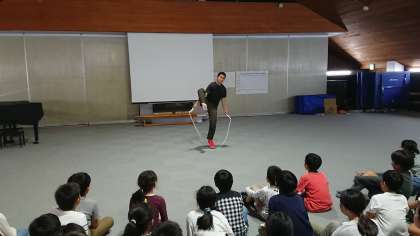 布団の敷き方を教えてもらったら、補助員のふっくんが、縄跳びのパフォーマンスを披露してくれました。実は、縄跳びパフォーマーなんだそうです。プロの凄い技に、みんな大歓声です。