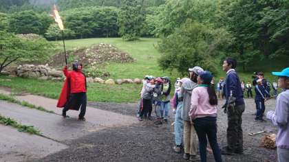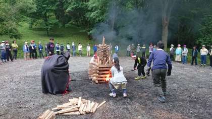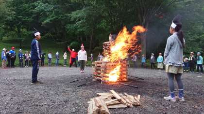 キャンプファイアが始まりました。火の神の登場にみんなびっくり。知恵の火、希望の火、正義の火、友情の火が見事に一つになりました。