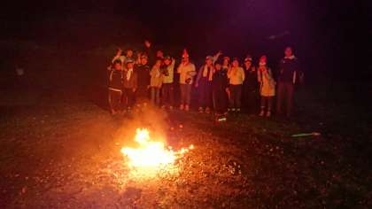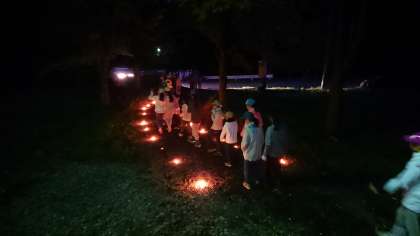 キャンプファイア終わりました。ファイアロードを子どもたちが帰っていきました。キャンプファイア係の子どもたち、本当によくがんばりました。お疲れ様です。