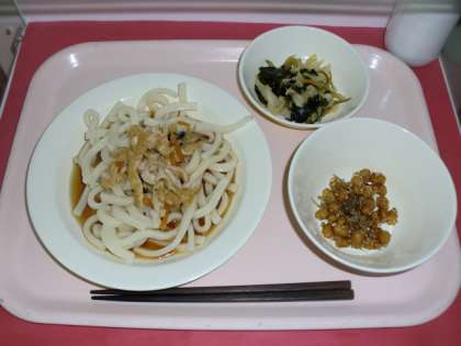 冷やしきつねうどん 牛乳 大豆とじゃこの甘辛揚げ