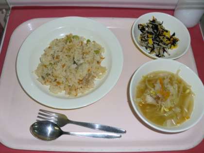山菜ピラフ 牛乳 ベーコンと野菜のスープ