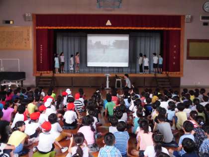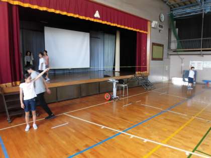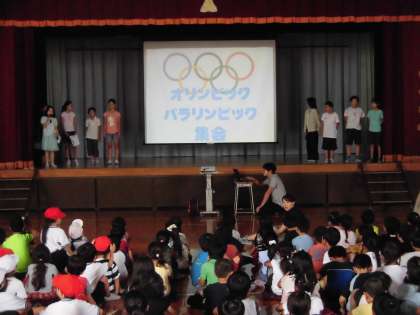 オリンピック・パラリンピックに関連したクイズを集会委員が行いました。出題の際に、子どもが実際に走ってみたり、シュートをしてみたりする映像を流したり、正解発表の際にどのくらいの長さなのかスズランテープで示したりと、興味をひく工夫が素晴らしかったです。