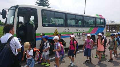 スクールバスに乗って、舟形小学校に向かいます。