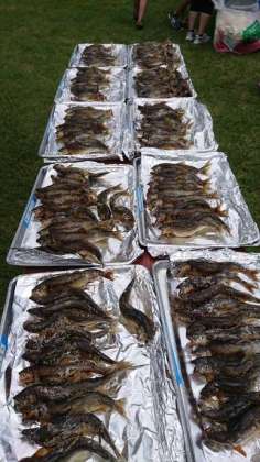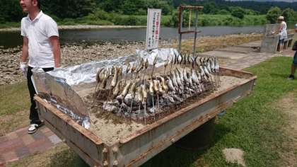 鮎は舟形の皆さんが河原で塩焼きにしてくださいます。全員分の鮎の塩焼き、すごい分量をずっと焼き続けています。本当に感謝です。