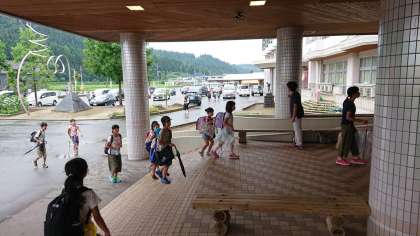 子どもたちが登校してきました。初日と違って、みんな打ち解けています。これから、花笠踊りの練習です。