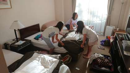 昨夜は疲れもあって、みんなあっという間に眠りについていました。起床して、部屋の片付けをはじめています。