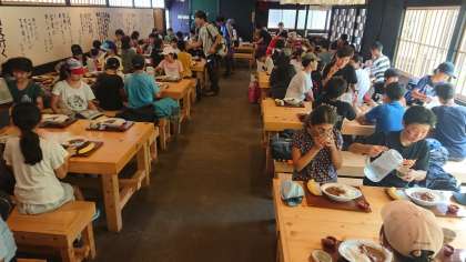 江戸村の食堂で、カレーをいただきます。みんな、江戸村堪能したようです。