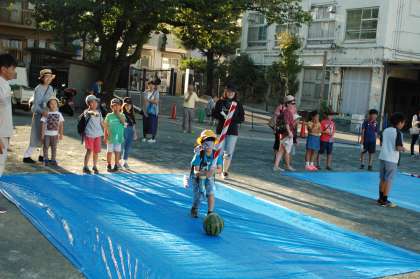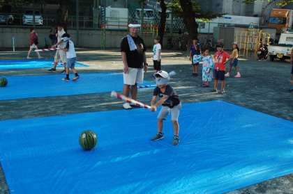 すでに、スイカ割りが始まりました。校庭には、子どもたちの歓声が響いています。