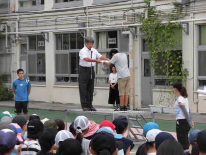 ラジオ体操皆勤賞と、夏休み水泳教室の皆勤賞の表彰が行われました。継続することは個人の力につながります。今後の自信につなげてください。