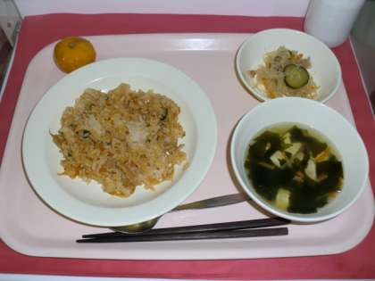 キムチチャーハン 牛乳 春雨サラダ わかめスープ