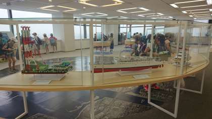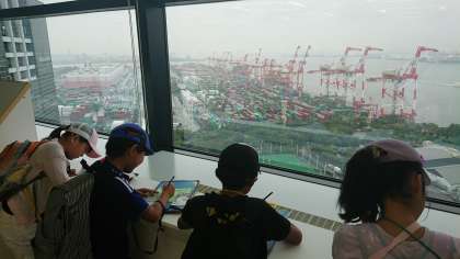 次はミナトリエです。東京の物流の玄関口、東京港が目の前に広がります。先ほどの東京タワーからの風景とは、かなりちがいます。