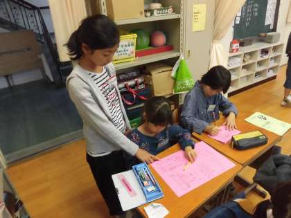 6年生は説明する人と、下級生の面倒を見る人に分かれ、名前を書く位置を教えてあげたり、わからない遊びについて詳しく説明するなどしていました。
