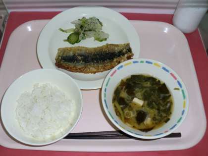 麦入りごはん 牛乳 さんまのかば焼き ゆかり和え