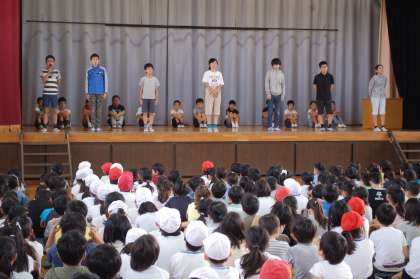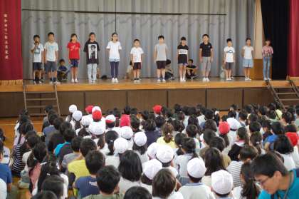 朝の全校集会で、後期の委員長が、それぞれの委員会の仕事を紹介しました。代表委員は全員ががんばりたいことを全校生徒の前で宣言し、後期の活動の意気込みを語りました。