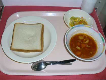 *ミネストローネは、イタリアの野菜スープです。トマト やパスタが入っているのが特徴です。今日のミネストローネには、