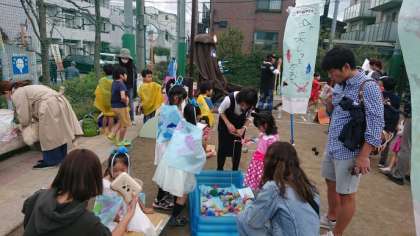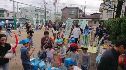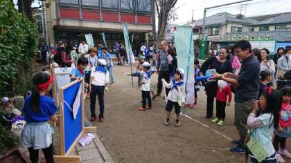 子どもたちが今日に向けて自分たちで考え、準備してきたゲームコーナーがたくさん並んでいます。まずは、外回りです。太田先生がチャレンジしていました。
