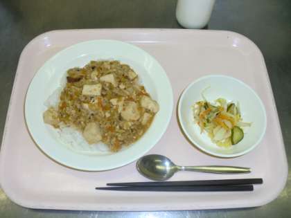 麻婆豆腐丼 牛乳 白菜の中華サラダ