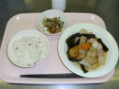 カリカリ梅ごはん 牛乳 おでん 野菜ののり和え