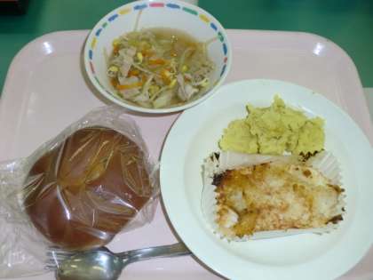 黒砂糖パン 魚のパン粉焼き ベーコンと野菜のスープ