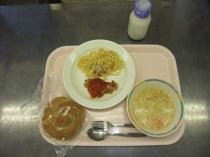 チキンをメインにして、スパゲッティや、スープ、パンと