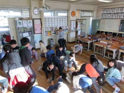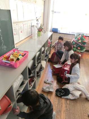 終業式のあとは、みんなで大そうじです。1年間お世話になった教室、校舎をきれいにします。冷たい水に手をひたし、ぬれぶきで掃除していました。6年生は流しや玄関など、教室以外の場所もきれいにしていました。