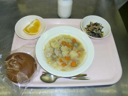 ココアパン 牛乳 ポトフ 満点サラダ くだもの
