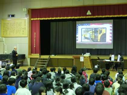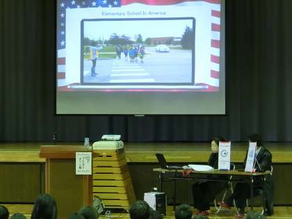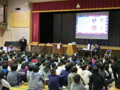 1〜3年生と、4〜6年生に分けて2回、アメリカ文化と日本文化を比較しながら、分かりやすく講演していただきました。質疑応答の時間もあり、子ども達はアメリカの文化や生活に触れることができました。