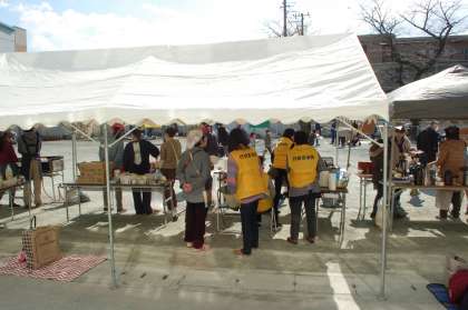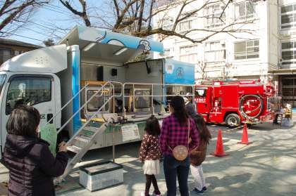 おだやかな天気の下、花見堂防災フェスティバルが開催されました。スタンプラリー方式で、防災体験コーナーをいろいろとまわったり、起震車や消防車で体験したり、関係団体の食べ物コーナーでおいしいものを食べたりと、とっても楽しいイベントでした。