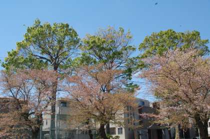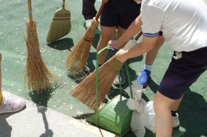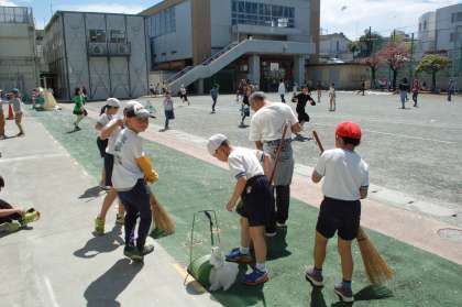 休み時間、主事さんが桜の花びらを掃いていると、「手伝います」と言って4年生の子どもたちが数人、進んでお手伝いをしていました。春の日差しのように心温まる光景でした。少しずつ濃くなってきたケヤキの緑も、優しくその様子を見ていました。