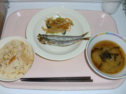 たけのこごはん 牛乳 焼きししゃも みそ汁