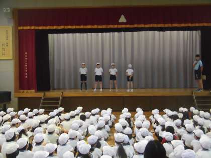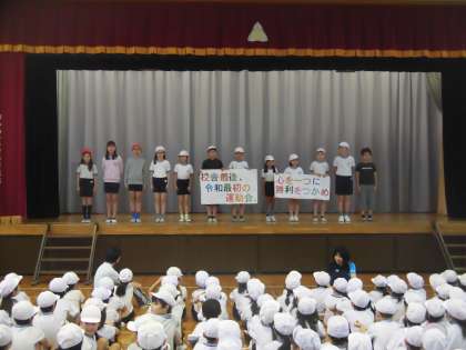 運動会に向けて、全校で集団行動を確認しました。見本には運動委員児童が立って、実際に動きを見せてくれました。気をつけ、前へならえ、右向け右、左向け左、回れ右など、1年生も一緒に、体育主任の先生の号令で一斉に行動する練習ができました。