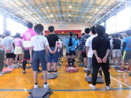 音楽朝会では運動会に向けて校歌と運動会の歌を全校で練習しました。歌を歌う姿勢と、腕を振り上げる動きを確認しました。歌いやすい姿勢としては、写真のように腕を体の横に下げる姿勢と、後ろにする姿勢、どちらかでいいと指導されました。
