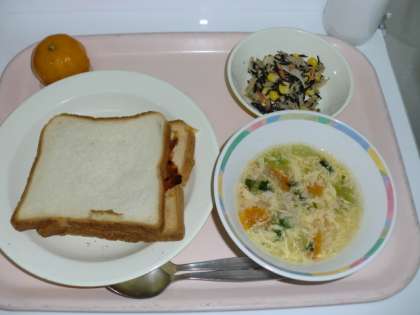 ピザトースト 牛乳 卵スープ 満点サラダ
