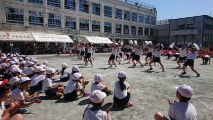 暑さに負けずがんばりましょう。まずは、応援合戦です。