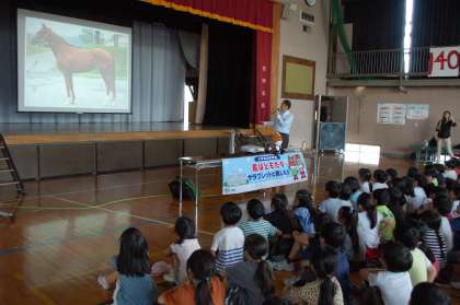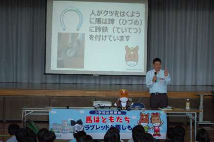 「ひざはどこでしょう。」「馬の視界はどこまでかわかりますか。」「サラブレットは時速何kmで走ると思いますか。」クイズには大盛り上がり!