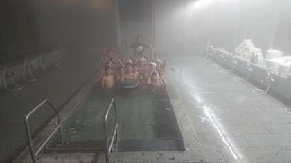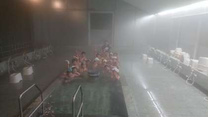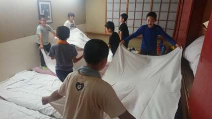 ふじやまビレジは温泉です。汗を流してさっぱりしました。裏では、みんなで協力して、布団敷きです。