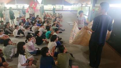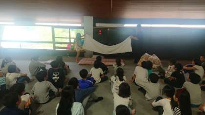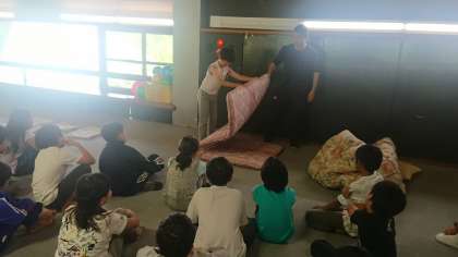 布団の片付け方をふっくんに教えてもらいました。最近は、ベッドの生活が多いので、こういう経験がない子どもが多いです。これからに役立ってほしいです。